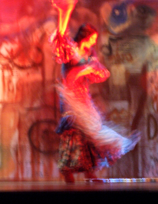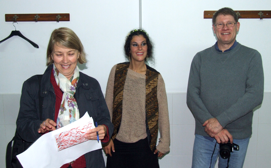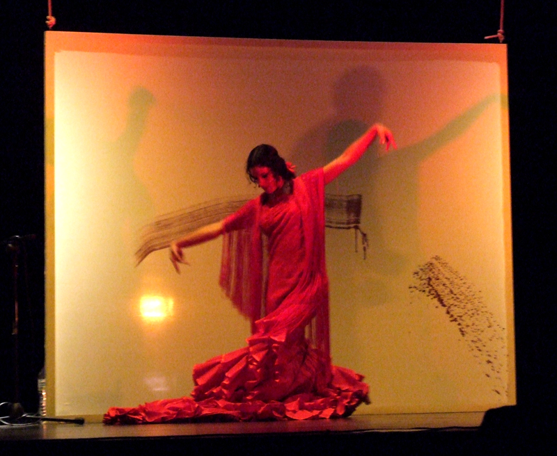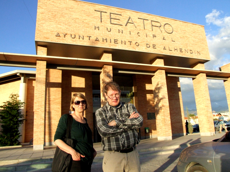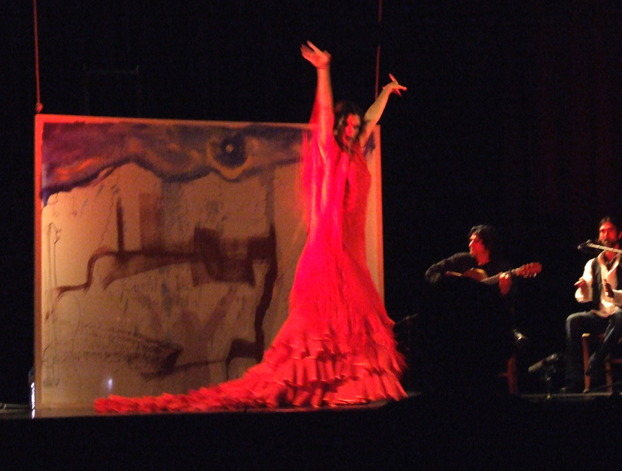 Chicago printmaker, Cathy Naro, who was here last year around this time, has returned for another workshop with Maureen. This time they’re working on combining some of the solar-plate prints Cathy made last time with liquid-metal techniques. Accompanied by her husband, Mike, this time Cathy again showed her remarkable capacity for hitting on fascinating cultural events in Granada. This weekend they coincided with an art exhibition put on by a group of young Granada artists at the municipal theater in Alhendín, a nearby town, and the show included a smashing performance of flamenco song, guitar and dance. Let’s give credit: the group is called Los Niños de la Vereda de Enmedio de Sacromonte. But their performance far surpassed the usual bog-standard Sacromonte flamenco tablao for the tourist trade.