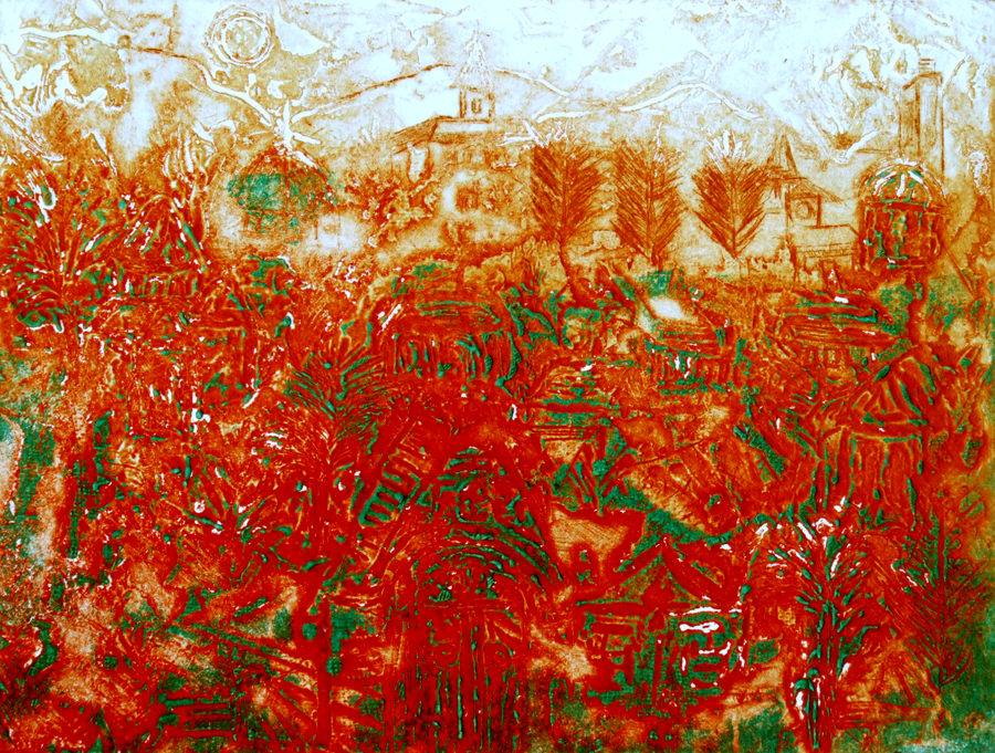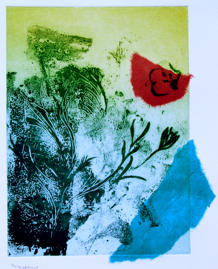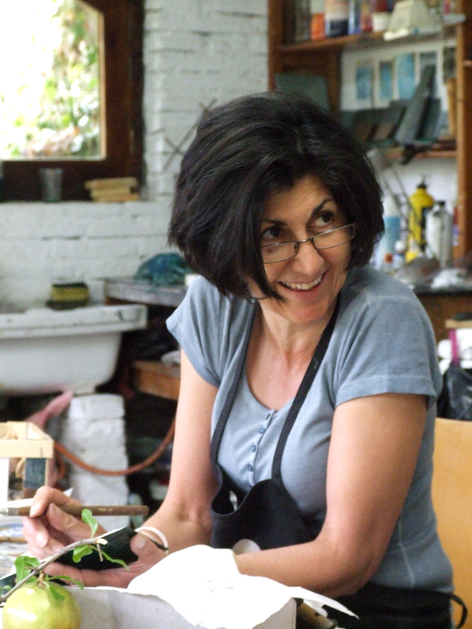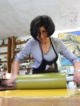 Jini Grinwald made her reservation a year in advance. She wanted to spend the month of September in the Gallinero and working with Maureen in the studio. She had studied printmaking at Melbourne University, “but that was a long time ago,” and she thought she needed to learn some new approaches. “Traditional printmaking didn’t offer me enough sponteneity,” says Jini. “I needed some techniques capable of offering me more freedom, more fun, not the same old kitchen chores.” Jini caught the plane back to Australia this morning, but before she left she had time to answer some questions in the airport coffee shop: