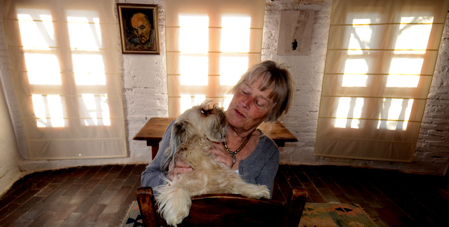 When our son got married and left home we inherited his bedroom, a place with a separate entrance at the west end of the house. For years we used it as an overflow area and called it “the Print Room,” because I stored some prints there. Mainly it was home to my paper cutter. (That black artifact on a wooden stand behind my right elbow in the photo is a cast-iron guillotine built around the end of the 19th century in Leipzig, Germany. It still cuts paper, cardboard and solar plates beautifully.) With time, however, the roof began to leak and the Print Room became a cold, damp, unpleasant place.