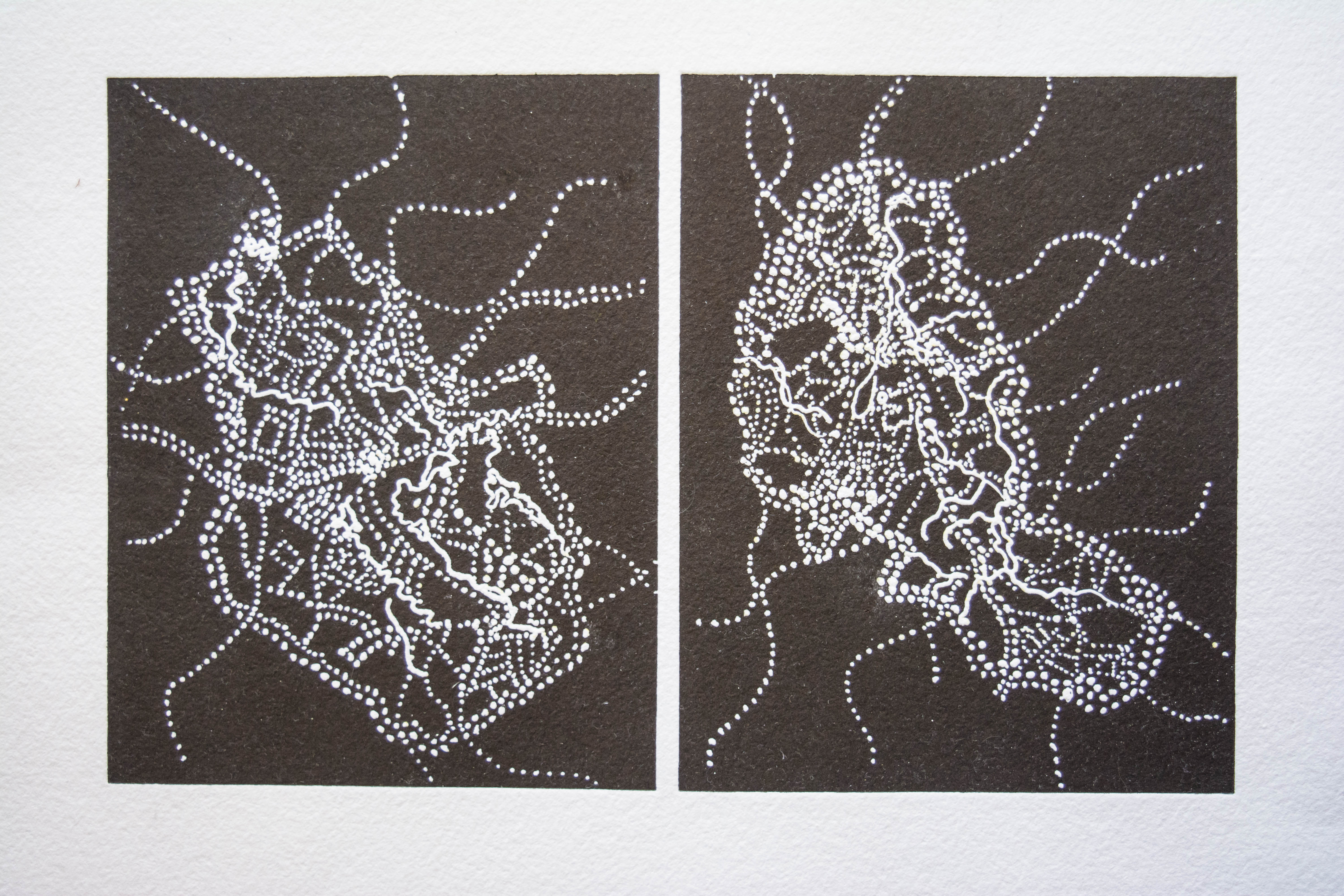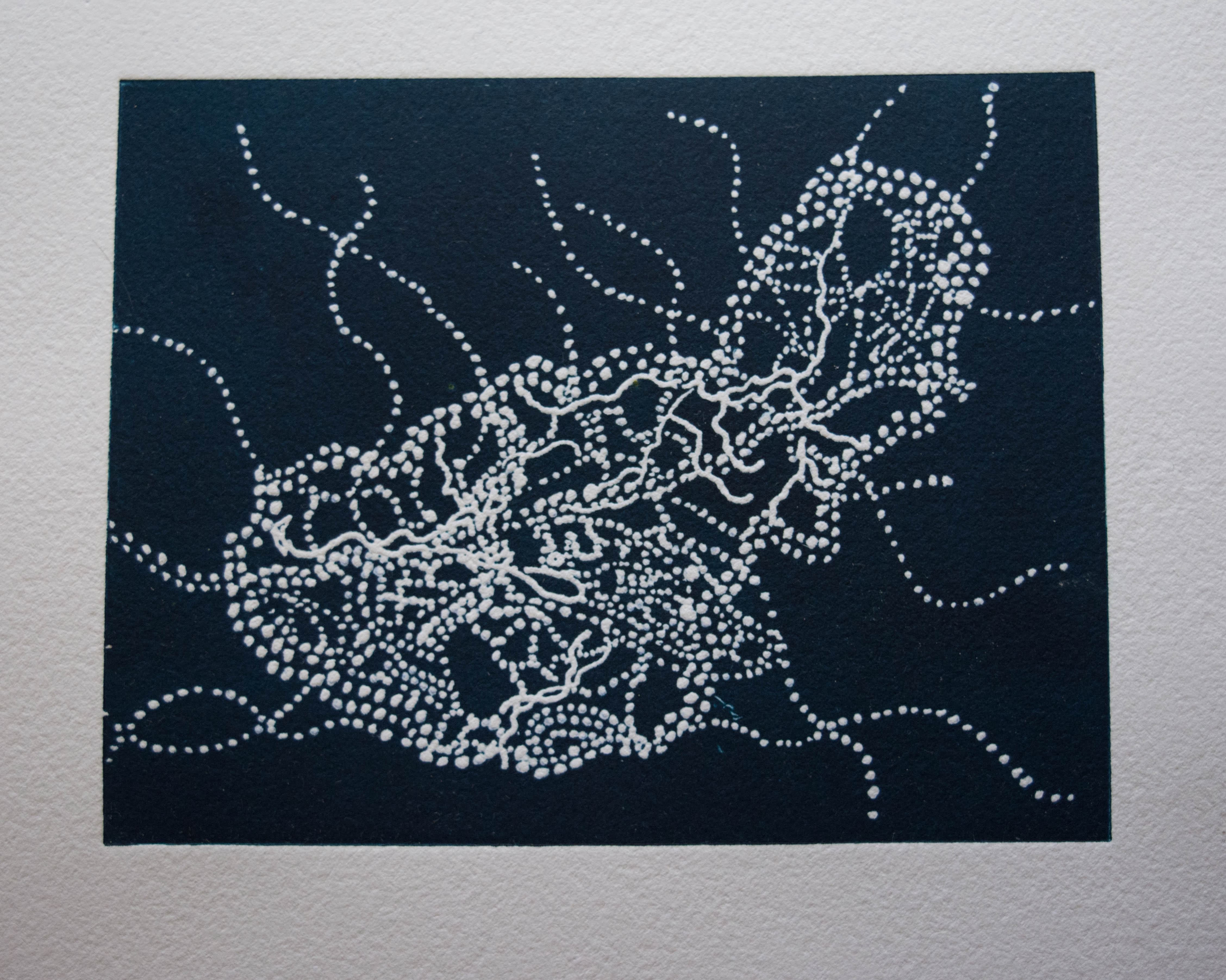 She was off and running, converted from a lost puppy into an alpha she-wolf in her chosen terrain. When she had a few sketches she chose the best of them and we turned them into negative solarplate prints, along with a couple of positive intaglio plates and did some interesting ghost prints. She liked the negative relief prints, and soon adopted negative solarplate as her medium of choice. She liked it for its flexibility of treatments, its total non-toxicity and its fast results. “This is a far cry from acid etching,” she affirms, “and the results are beautiful.”