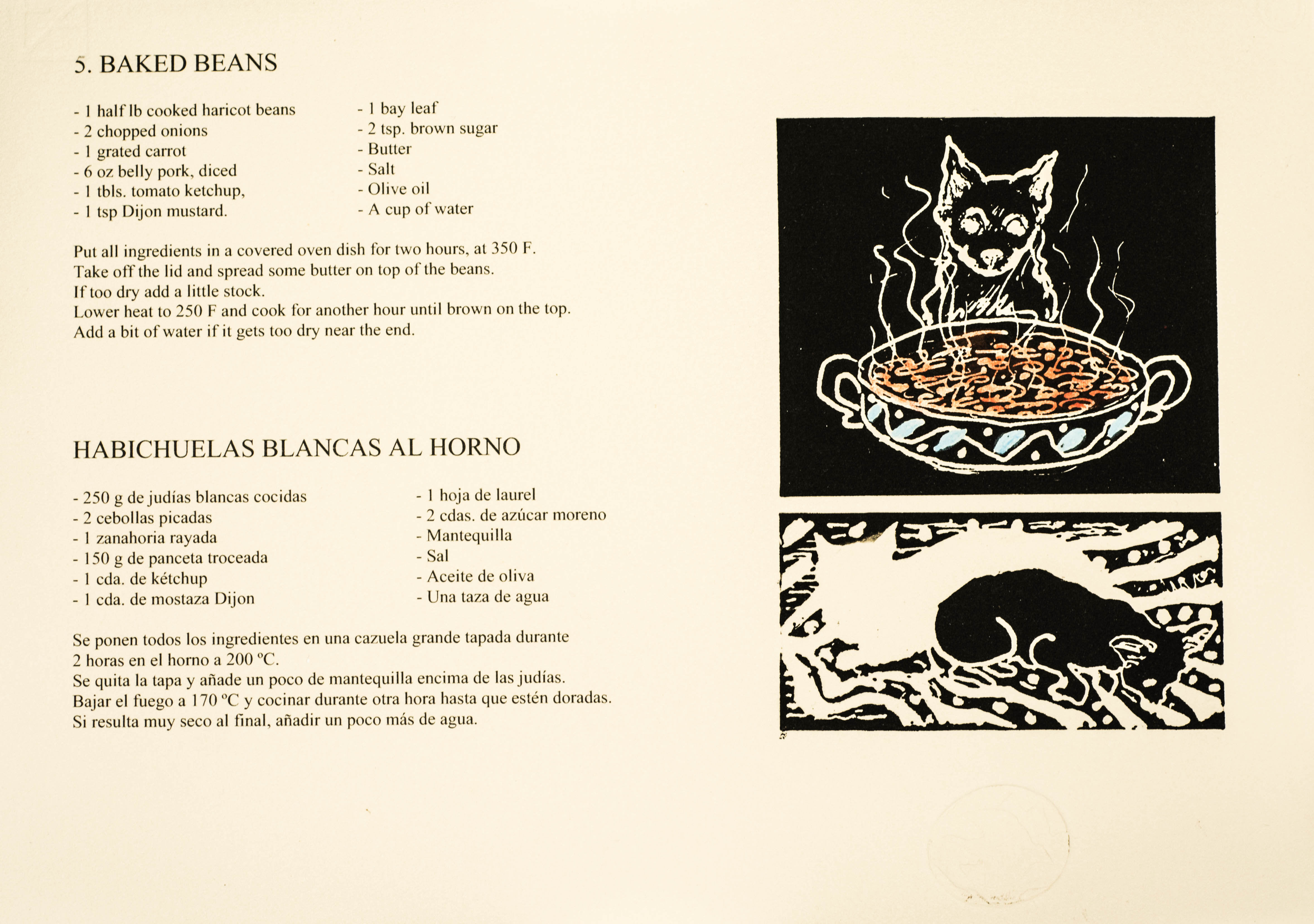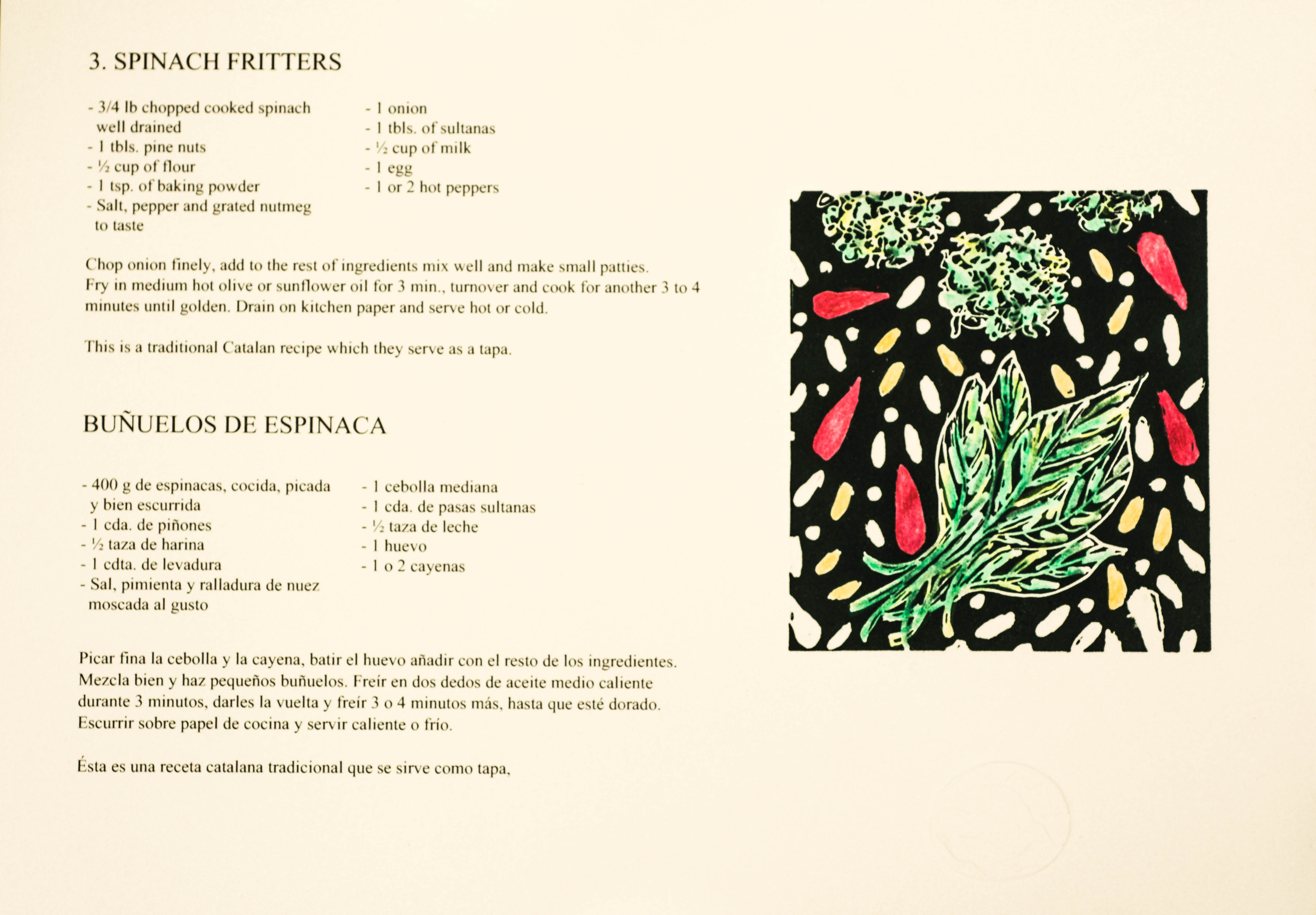 Preparing an edition is, beyond the image making, a lot of work. The Spanish would say it’s a combination of “arte y artesanía.” Once you’ve refined your sketches and burned them onto plates, you’ve got all that printing to do by hand. Though this edition is a small one, with only 19 portfolios, each one has 16 prints. Add to that the hand coloring of all of them. Then there was the text. As it is impractical to handwrite the recipes in English and Spanish on plates, the answer was a print shop and all the complication that entails. For both of these problems I had extraordinary luck close at hand. They are named María José, my near-daughter whom you have already met, and our neighbor, Ricardo, who owns one of Granada’s most exquisite print shops, la Imprenta del Arco. I’m forever thankful for his patience with all my changes and his excellent criteria concerning my doubts. And I don’t want to forget María José’s lovely daughter, Silvia Romera Braojos, who did the translation into Spanish and the formatting of the text.