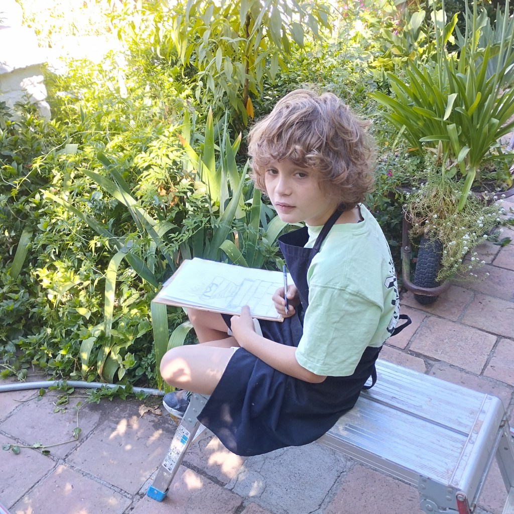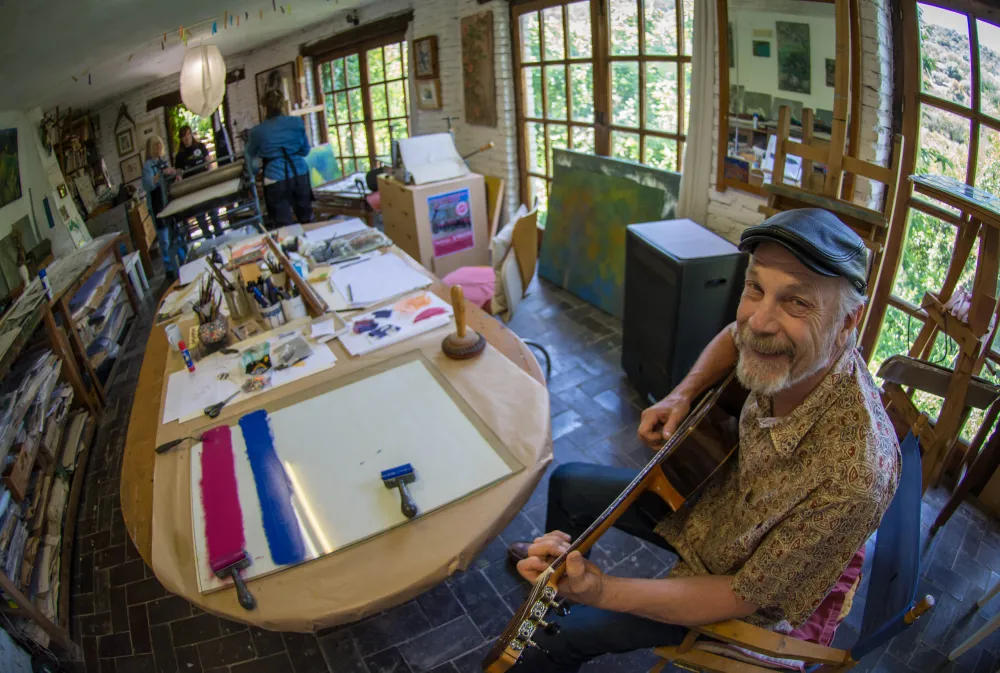 Occasionally a special occasion would arise when I had to take a week or two off painting to help out a friend who required some printmaking. The first one was our longtime neighbor and friend, Antoine, whose sister was coming down from Bordeaux with her two children, Sofía and Bruno, ages seven and five. She wanted to introduce them to printmaking. “Children?” the expression on my face said. Antoine said just, “You’ll see.” You must remember, this is a good, old friend. I spent a week making prints with the two children and their mother. All had artistic talent. But the five-year-old boy, Bruno, was a genius. That was my first experience with special-needs children—whose necessity is to be treated as artists. Later I encountered another one close to home. It’s my five-year-old great grandson, Samuel, who has been drawing since he was two. Whenever he arrives, he asks for a pen and paper and spends half a day drawing. The results are fascinating. I would love to see what a child psychiatrist would have to say.