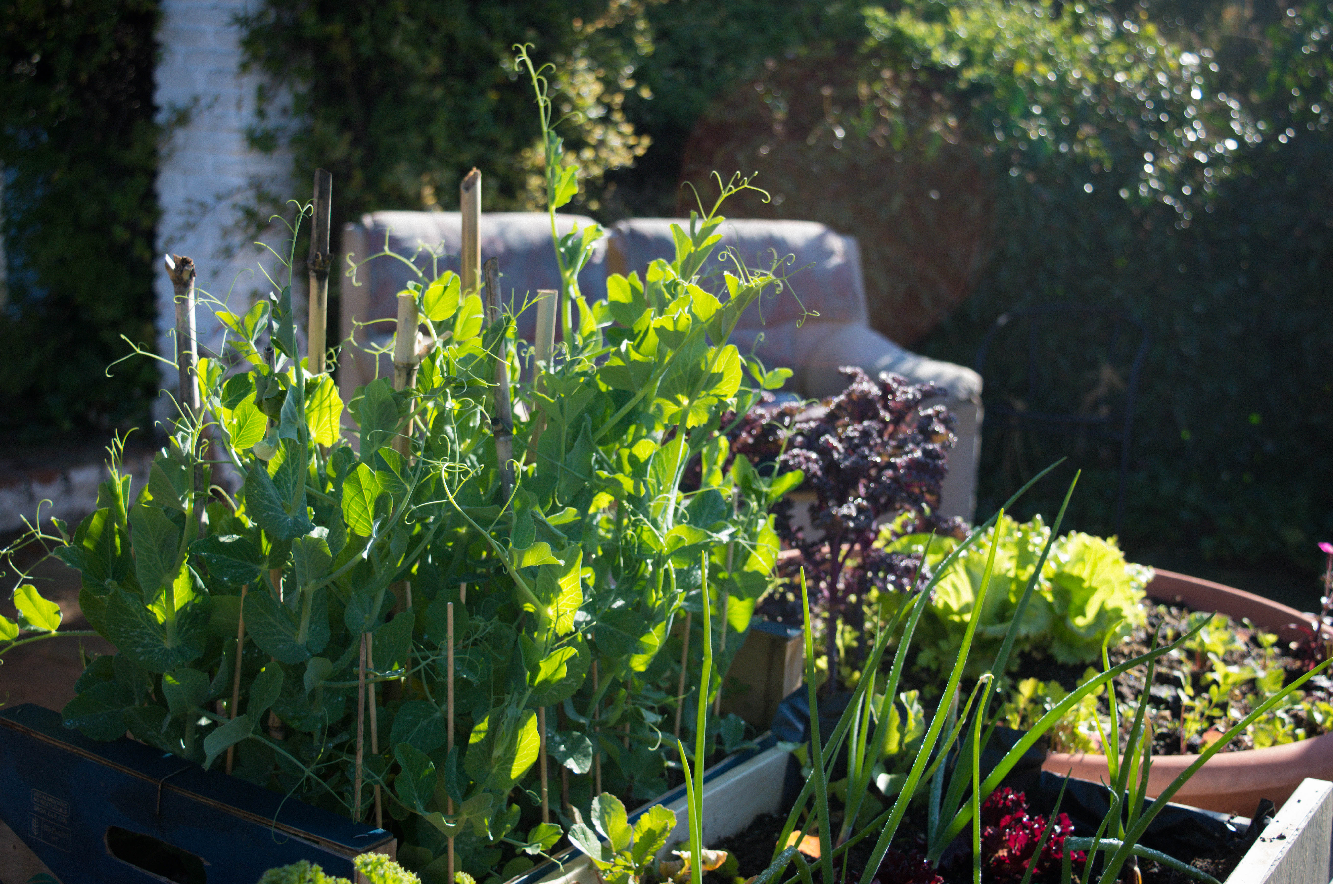 The beauty of the box garden is that you can pick them up and put them in the shade when necessary. When I started out I was looking forward to just the fun of having little vegetable plants in boxes, like potted flowers. But it turns out that you can actually eat the crops. There are always some leaves you can snip off to brighten up a salad or a stew, and you can pretend that the tops of the red onions are chives. We’ve just started eating the peas raw. Sooo sweet. If you decide give a box garden a try I have a warning for you: You will get hooked. How do I know? At the place where I go to buy plants I coincide with other people who have box gardens and we swap stories enthusiastically. They’re hooked just like me.
