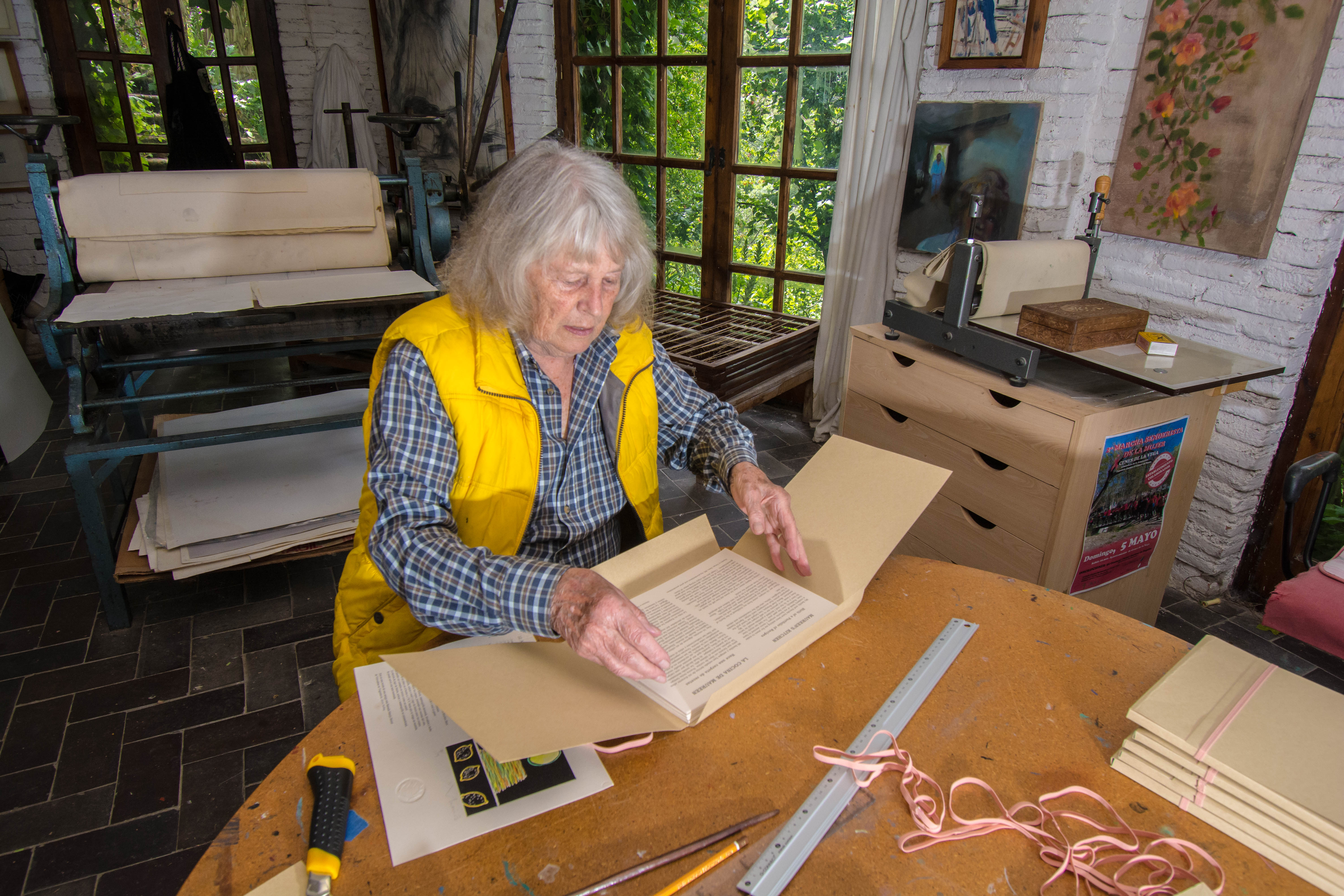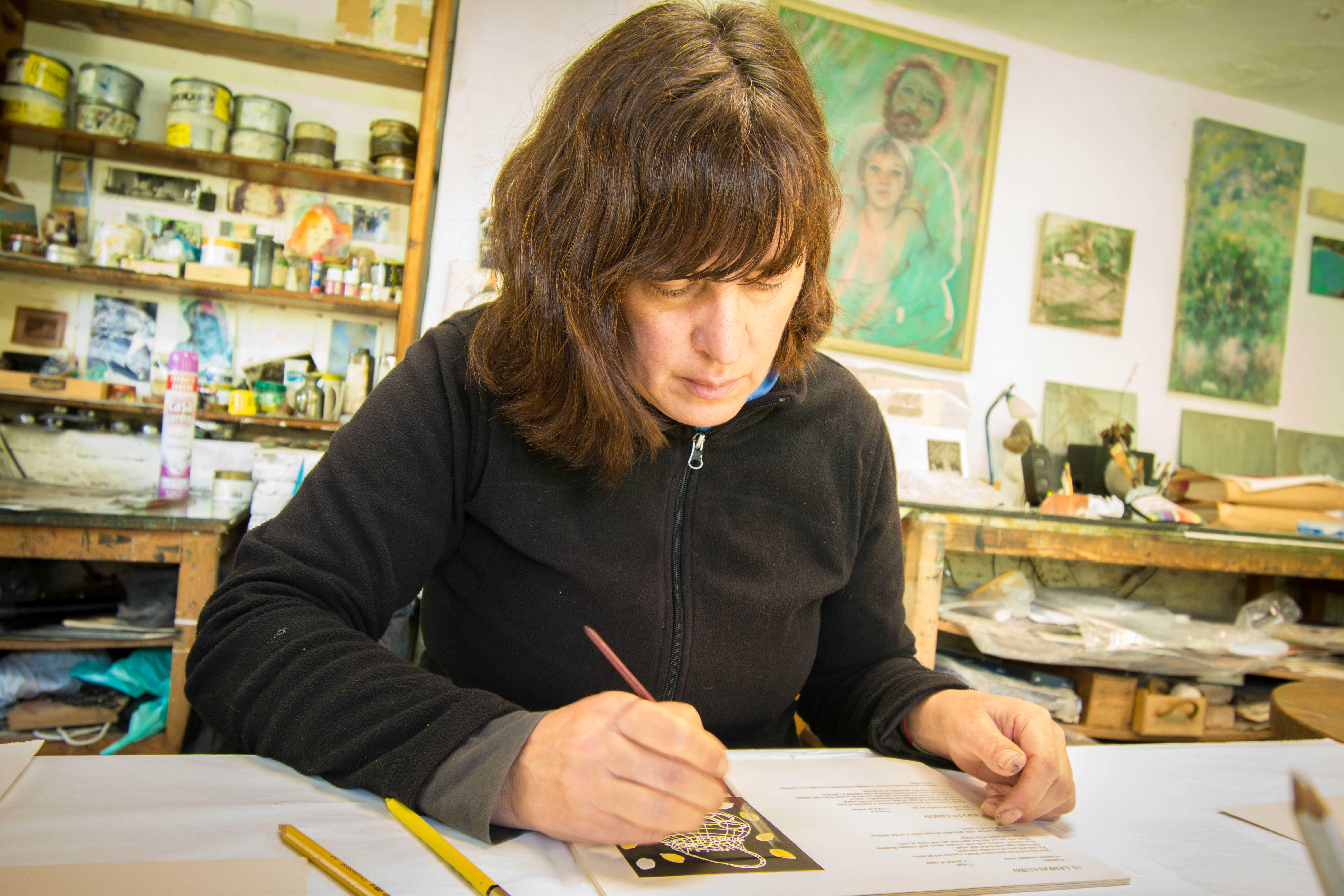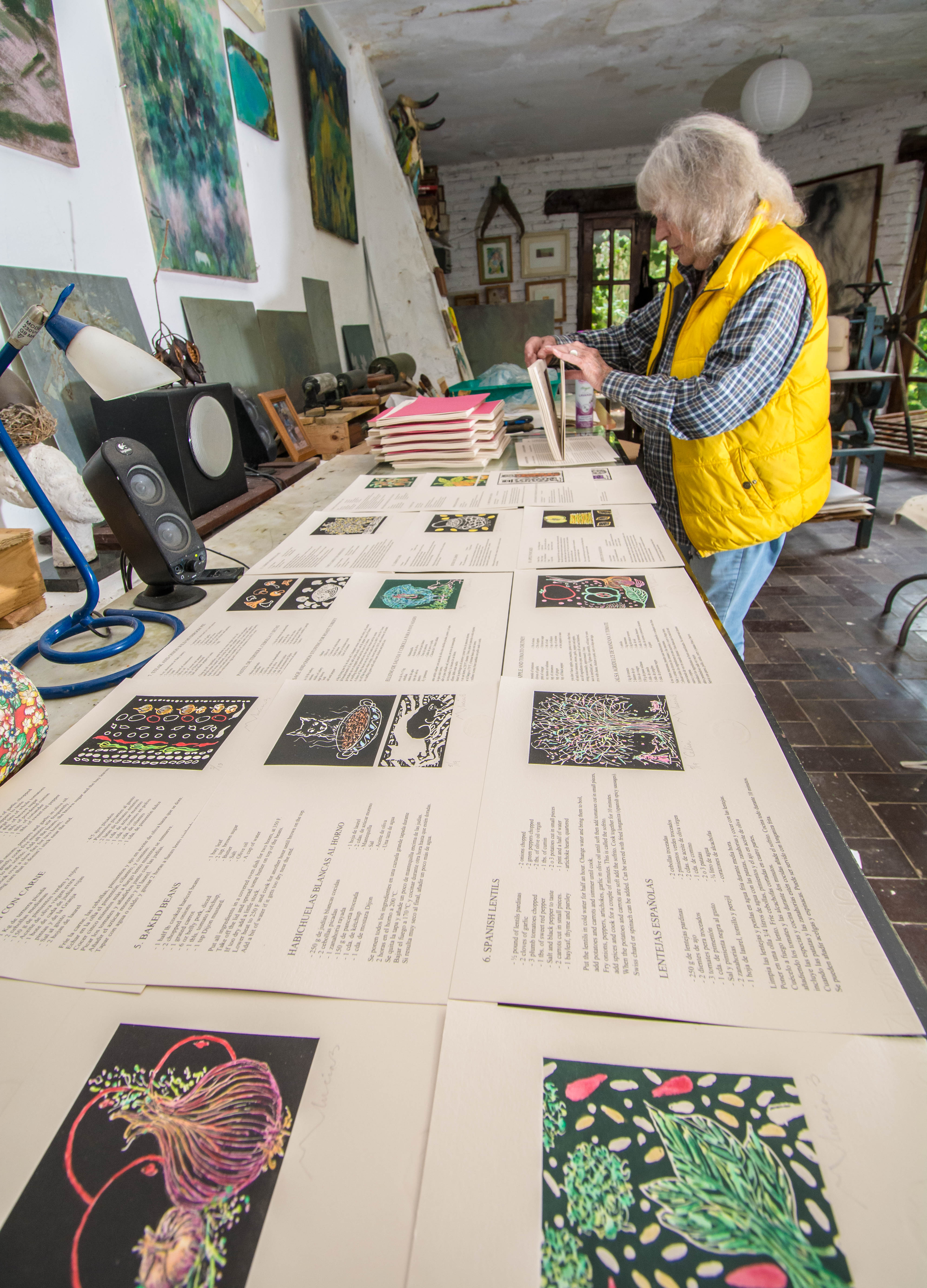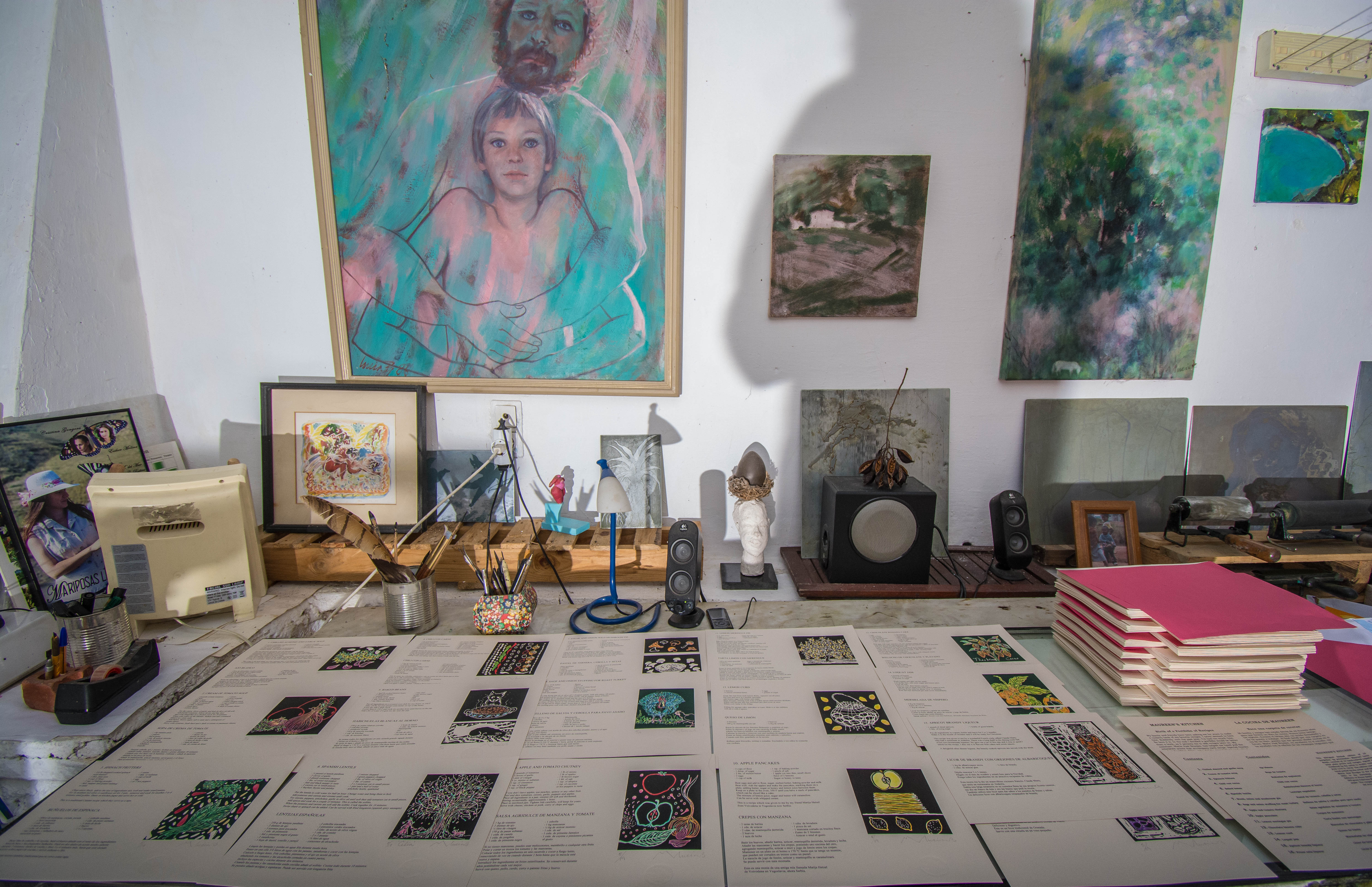 I worked for almost three years in that magnificent studio with a little kitchen and its own entrance from the street. I soon began to sell almost everything I painted–lots of local color–and to dream of living from my artwork. That sounded then like a fairy tale. Not quite. I just needed a dose of perseverence and little bit of madness. My next studio was a little stone goat shed on a rocky hillside above Pinos Genil, a village outside Granada. That was followed by a revamped chicken house, and finally a big well-lit studio that my husband Mike built for me. There I only painted until I was selected to study printmaking in the Rodríguez-Acosta Foundation in Granada (1977-80) under the tutelage of José García (Pepe) Lomas, a true master printmaker who left the south of Spain peppered with his disciples. A couple of years later the Foundation closed and I had the opportunity to buy one of their etching presses and all the tables and accessories necessary to convert my space into a fully-fledged printmaking studio. There, over the past 30-some years, I’ve received artists from around the world, to learn printmaking techniques with me.